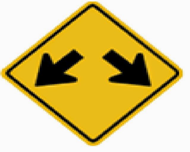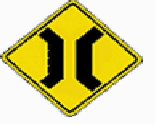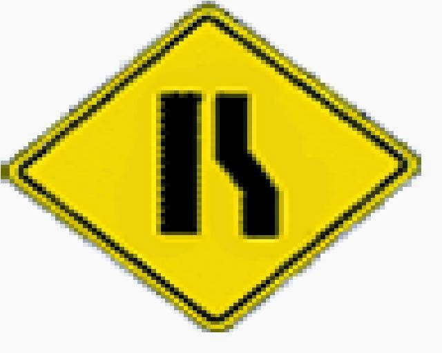 ง. ทางข้างหน้าแคบลงกว่าทางที่กำลังผ่านทั้งสองด้าน