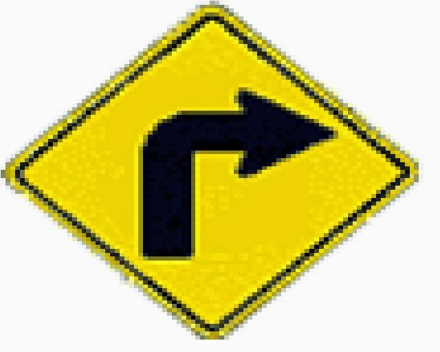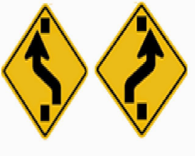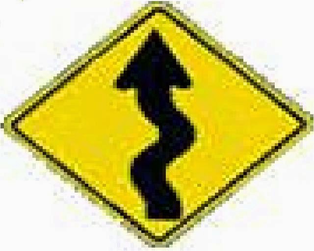 ก. ขับรถให้ช้าลง และระมัดระวังทางข้างหน้าเป็นทางคดเคี้ยวโดยเริ่มไปทางขวา